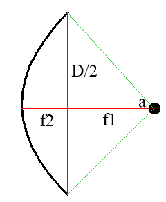 Zunächst mal gilt es zu ermittlen welchen Öffnungswinkel der Spiegel aus sich des Feeds hat. Dazu brauchen wir den f/D Wert aus den technischen Daten des Herstellers der Schüssel. D ist der Durchmesser und f ist der Abstand vom Feed zur Schüssel, im Bild f1 + f2.